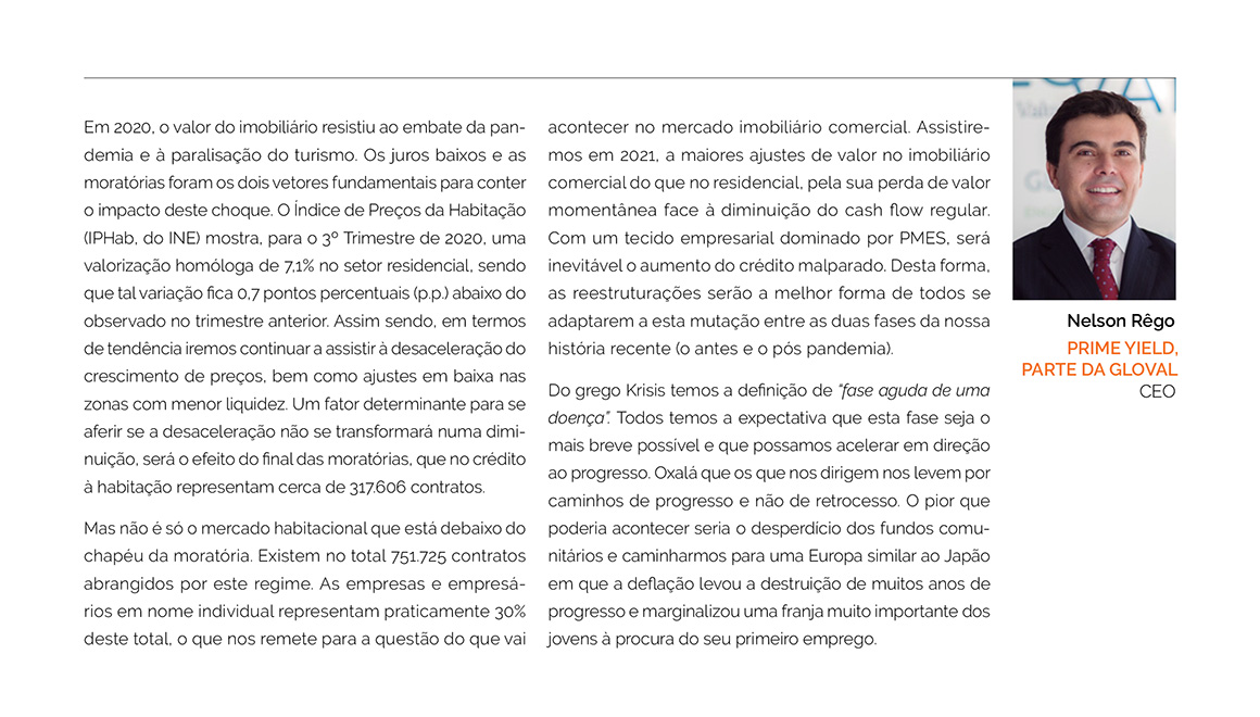 No arranque de um novo ano, Nelson Rêgo, CEO da Prime Yield, parte da Gloval, foi um dos especialistas convidados para o Barómetro da Vida Imobiliária sobre as perspetivas para o setor imobiliário em 2021. Nelson Rêgo destacou o final das moratórias como um dos fatores que será determinante para a evolução do mercado.