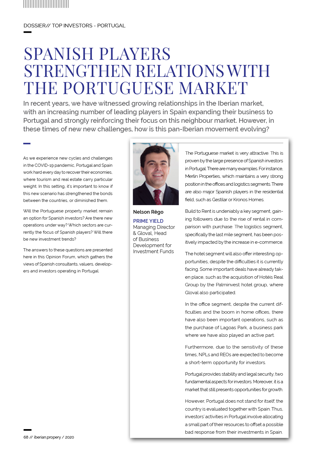 Nelson Rêgo, CEO da Prime Yield e Head of Business Development for Investment Funds da Gloval, foi uma das vozes ativas no fórum de opiniões da última edição da revista ibérica Iberian Property. Questionado sobre se Portugal continua a ser uma opção para os investidores espanhóis, o responsável frisou a atratividade do imobiliário nacional identificou os setores de maior oportunidade.